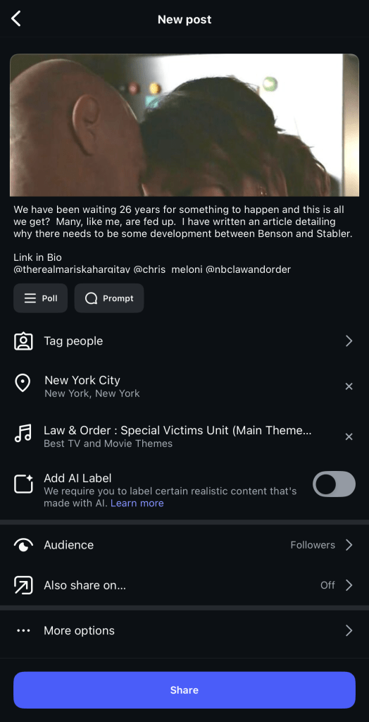 For Instagram, I used a more personal connection to the topic. There are a lot of fans and pages on Instagram, that this would appeal to. The “Link in Bio” is also a common practice on Instagram. Nobody really wants to see a big, long link that will cause them to scroll longer for the next post. The picture is a main selling point, because it was a very famous scene recently that resulted in much uproar. I also decided to add the theme music and location to further correspond to the topic of the article. Finally, I tagged both actors and the franchise itself.